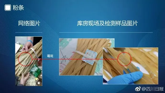 第六组是粉条照片。左边是网络流传的有霉斑的粉条照片;右边是库房及检测机构实验室拍摄的粉条照片。经专家和四川源坤国科质量检验有限公司检测人员鉴定,粉条表面有肉眼可见的霉斑,检验结果为不合格。