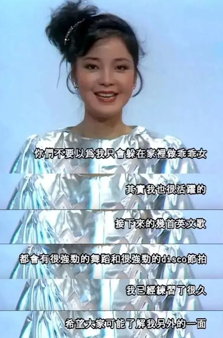 相反,在那个女孩子只要露胳膊就算离经叛道的年代,亦是她毫无顾忌地化起了烟熏妆,穿身小皮衣,顶着爆炸头表演了一曲劲爆的disco舞曲。