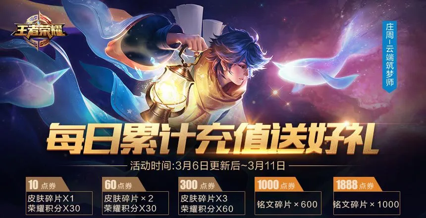每日充值送好礼,皮肤碎片荣耀积分大量铭文碎片等你拿!