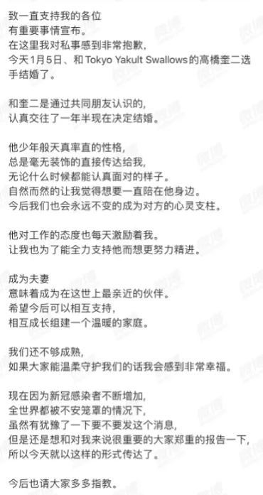 随后在2019年2月,当年32岁的篠田麻里子突然宣布结婚,结婚对象也是一位年下男,是圈外人士,比篠田麻里子小3岁。篠田麻里子在手写信中称“二人第一次单独吃饭就被求婚了,虽然还未交往过,但对方就是让她打心里认为是想要一生在一起的人”。不得不说这姐真的够飒。