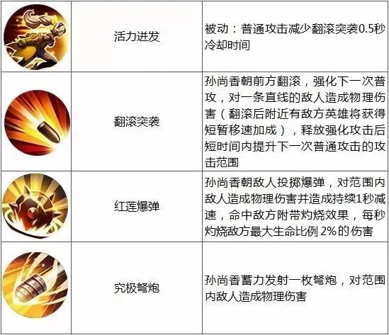 孙尚香在上一个版本变动的时候,2技能命中敌方附带灼烧效果,每秒灼烧敌方最大生命比例2%的伤害,后期打前排非常的痛~不过2技能的前摇动作很大,需要大量的练习,这周限免就是好机会啦。
