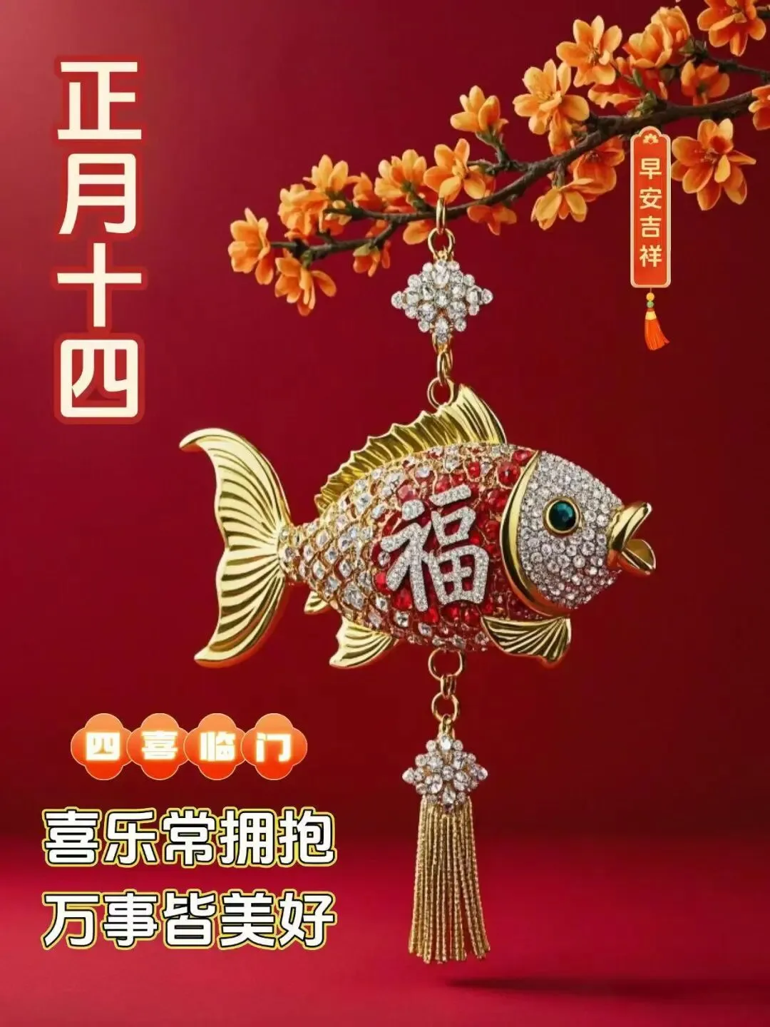 🐟💖💰正月十四祝你:一尾娃娃鱼,添福又添喜;一尾比目鱼,爱情甜蜜蜜;一尾美人鱼,心情好美丽;一尾金龙鱼,生活更神气。发祝福,讨口彩,马年年年有余哦!🧧🌊😄