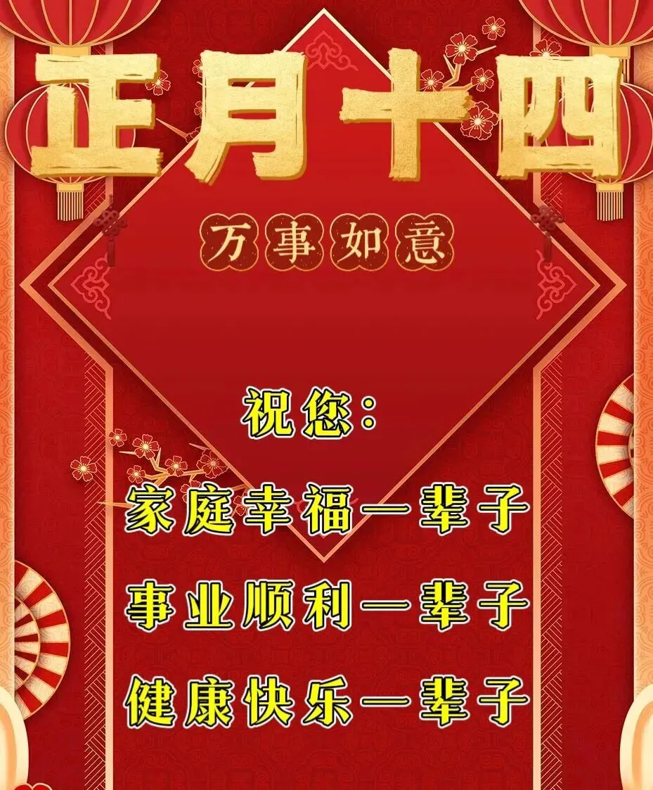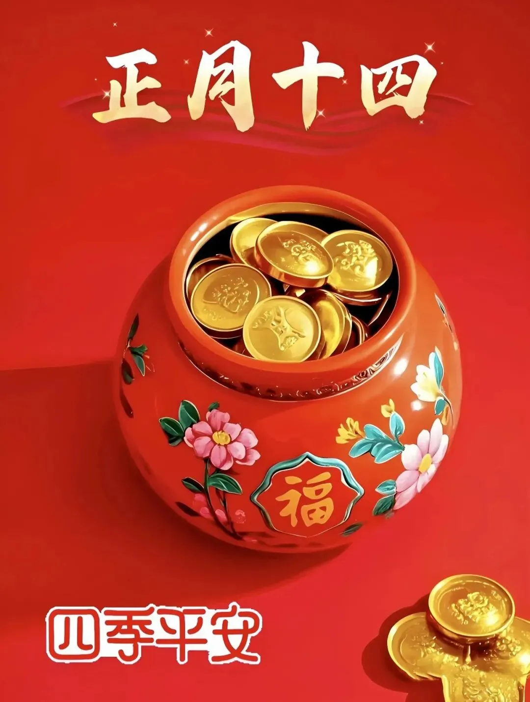 今天是正月十四,声声祝福送给你,祝你事事都如意,愿您四喜临门,四季平安;四季发财,四时安康,四季如春,事事如愿!