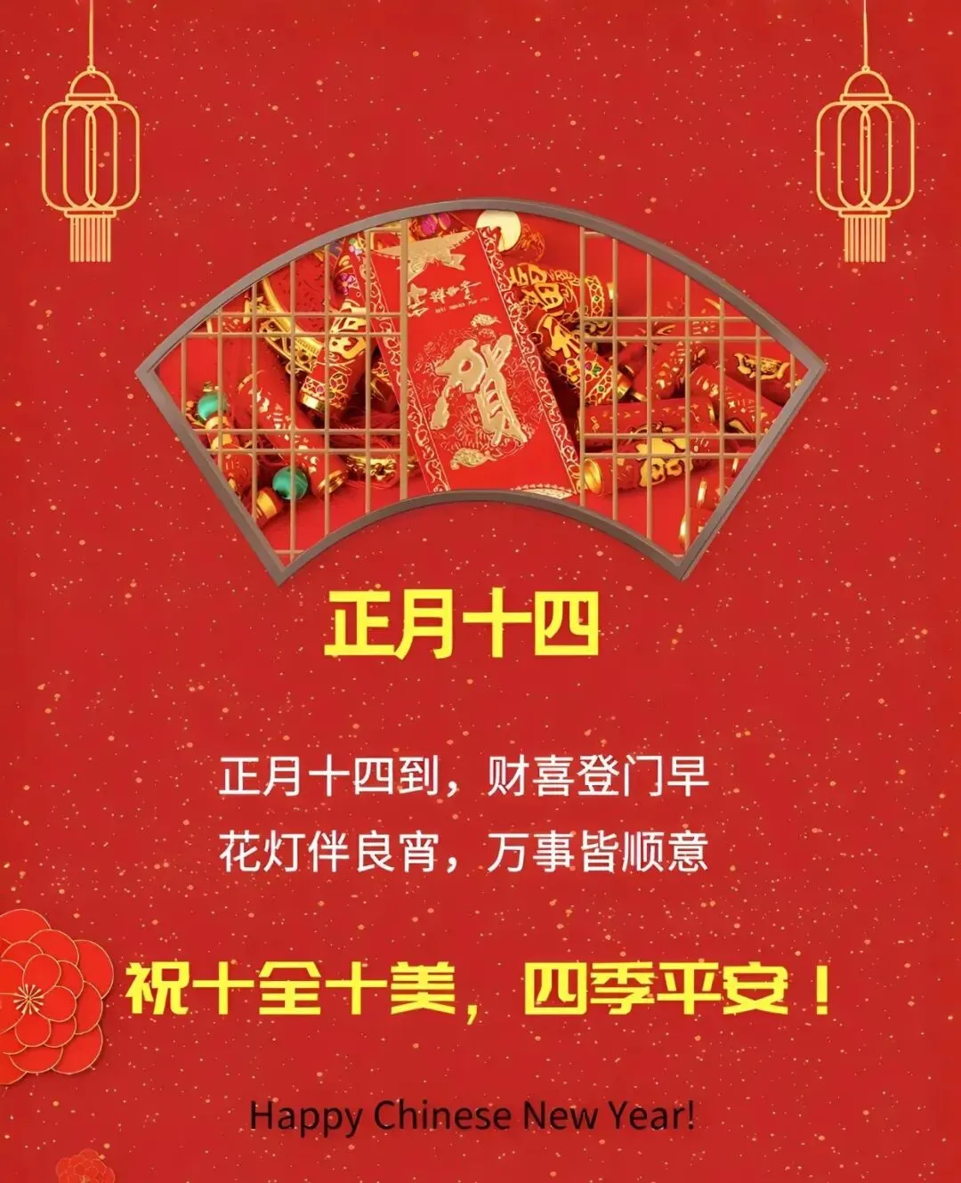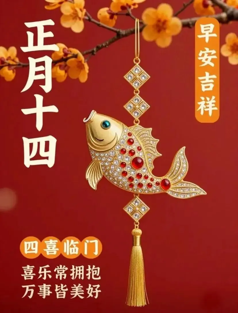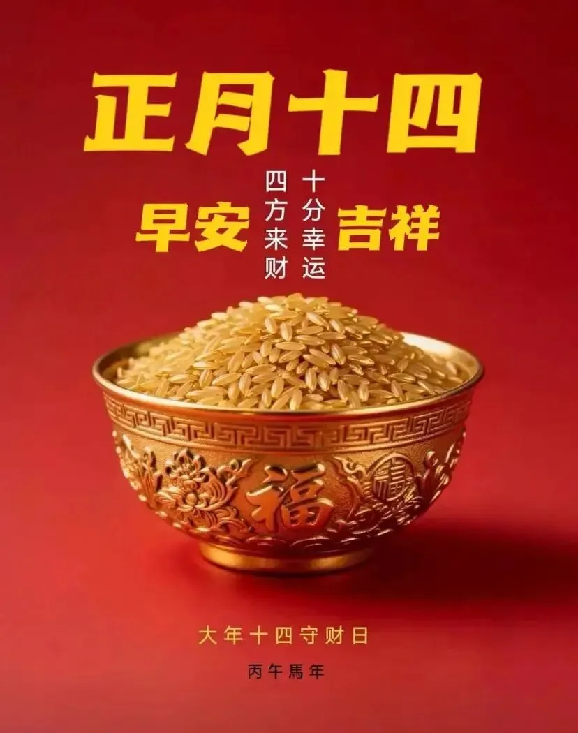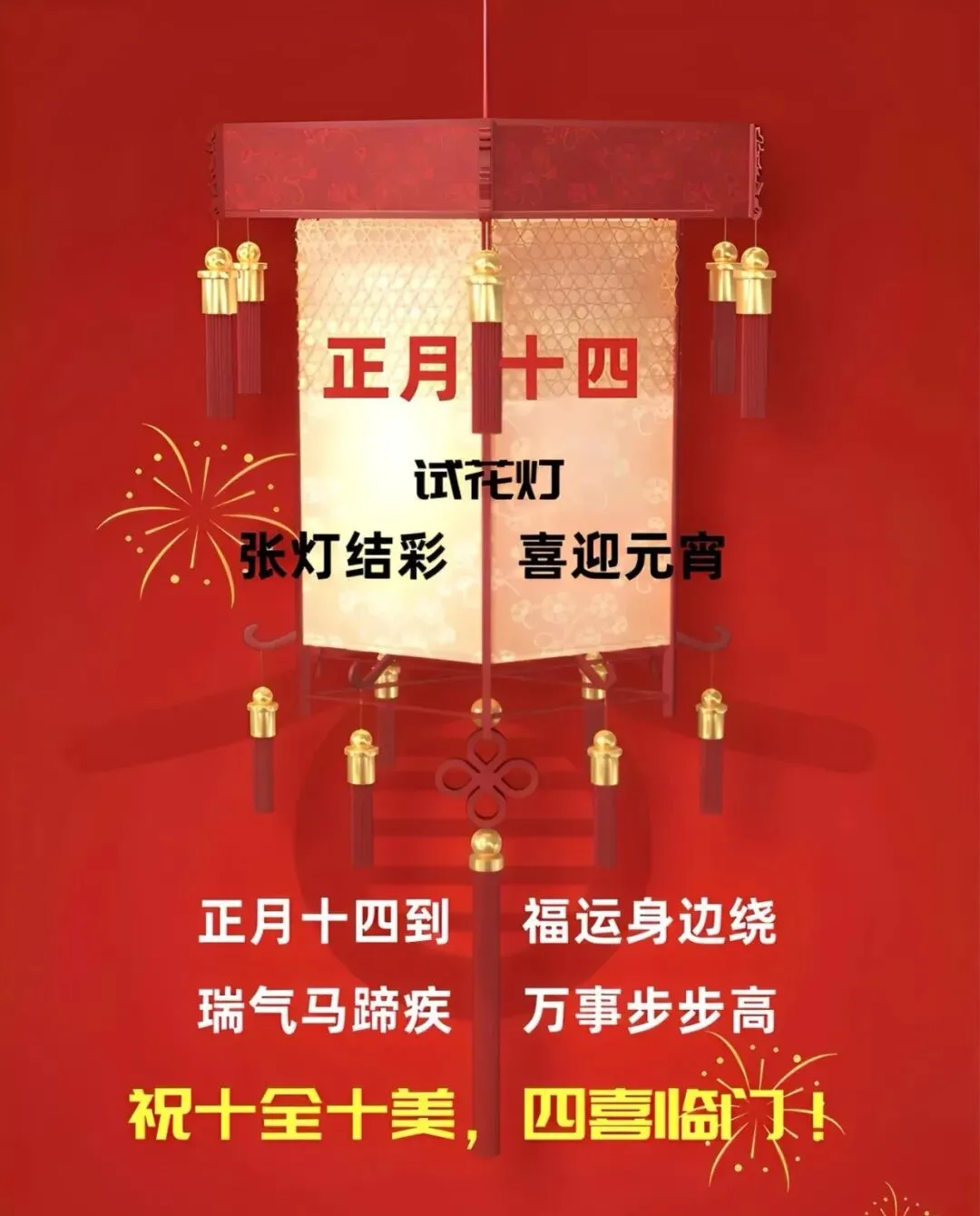 正月十四!马到福来,年味未散,元宵将至。愿快乐伴你、好运恋你、健康绕你、平安笑你;愿你忙而不茫,万事胜意。