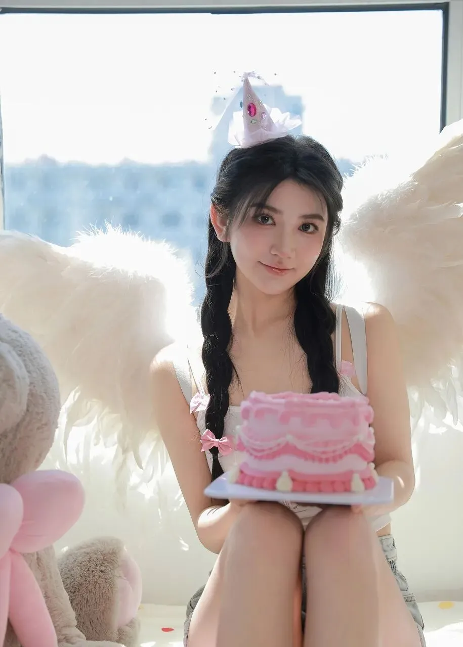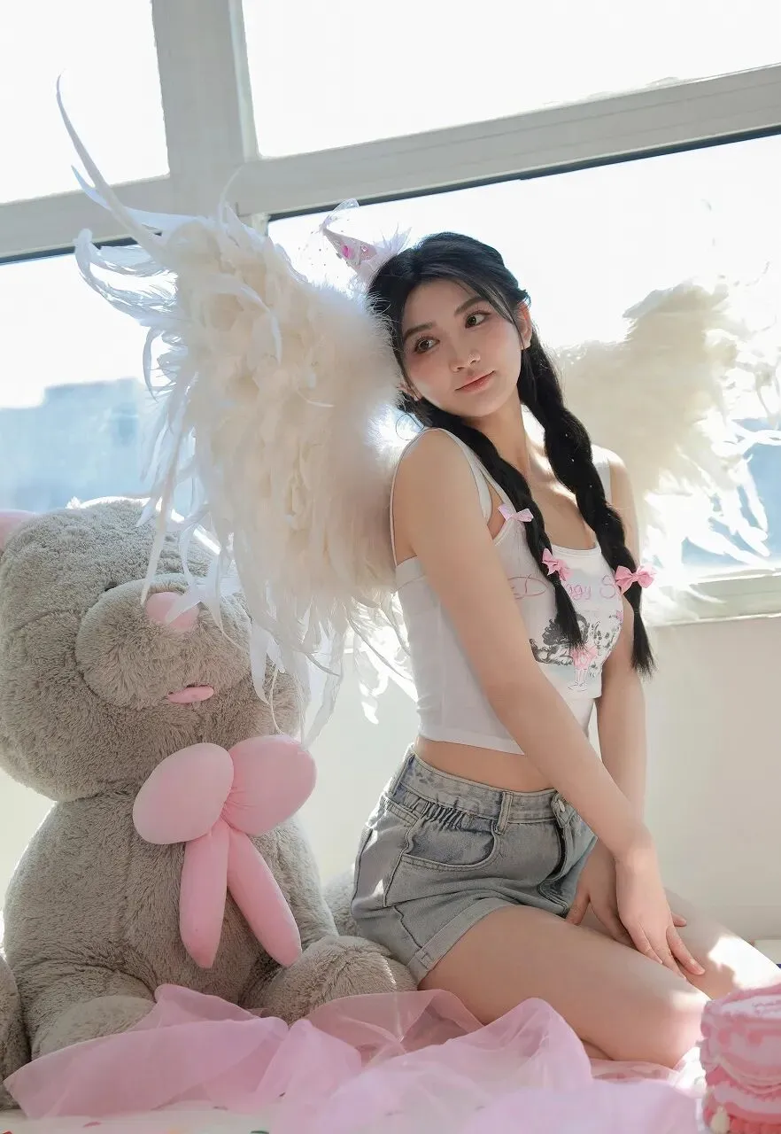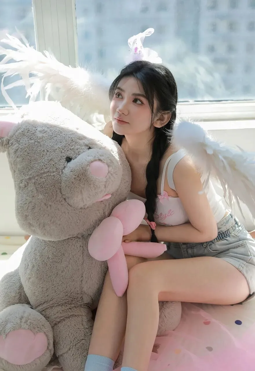 在城市的喧嚣中,总有一隅能让我们寻得内心的宁静与纯真。当阳光透过明亮的窗户,温柔地洒在房间内,一位宛如天使般的少女与一只巨大的毛绒熊相依而坐,这温馨美好的画面,仿佛将我们带入了一个梦幻的童话世界。少女身着简约的白色吊带背心,上面印着可爱的粉色字母,搭配着浅蓝色的牛仔短裤,清新自然又不失俏皮。她的双腿白皙纤细,穿着浅蓝色的袜子,显得格外柔美。最引人注目的,是她背后那一对洁白如雪的天使翅膀,羽毛轻盈蓬松,仿佛微风拂过便会轻轻颤动。头顶上,一个小巧的白色兔耳发饰,更增添了几分灵动与可爱。她坐在窗边,身旁紧挨着一只巨大的灰色毛绒熊。毛绒熊憨态可掬,圆圆的脑袋,粉粉的鼻子和脚掌,让人忍不住想要拥抱。少女的一只手臂温柔地搭在毛绒熊的身上,另一只手轻轻放在腿上,眼神望向远方,仿佛沉浸在美好的遐想之中。阳光透过窗户,形成一片片明亮的光斑,洒在她们身上,为整个画面增添了一层温暖的滤镜。窗外的城市建筑在阳光的照耀下若隐若现,与室内的温馨场景形成了鲜明的对比,却又奇妙地融合在一起。