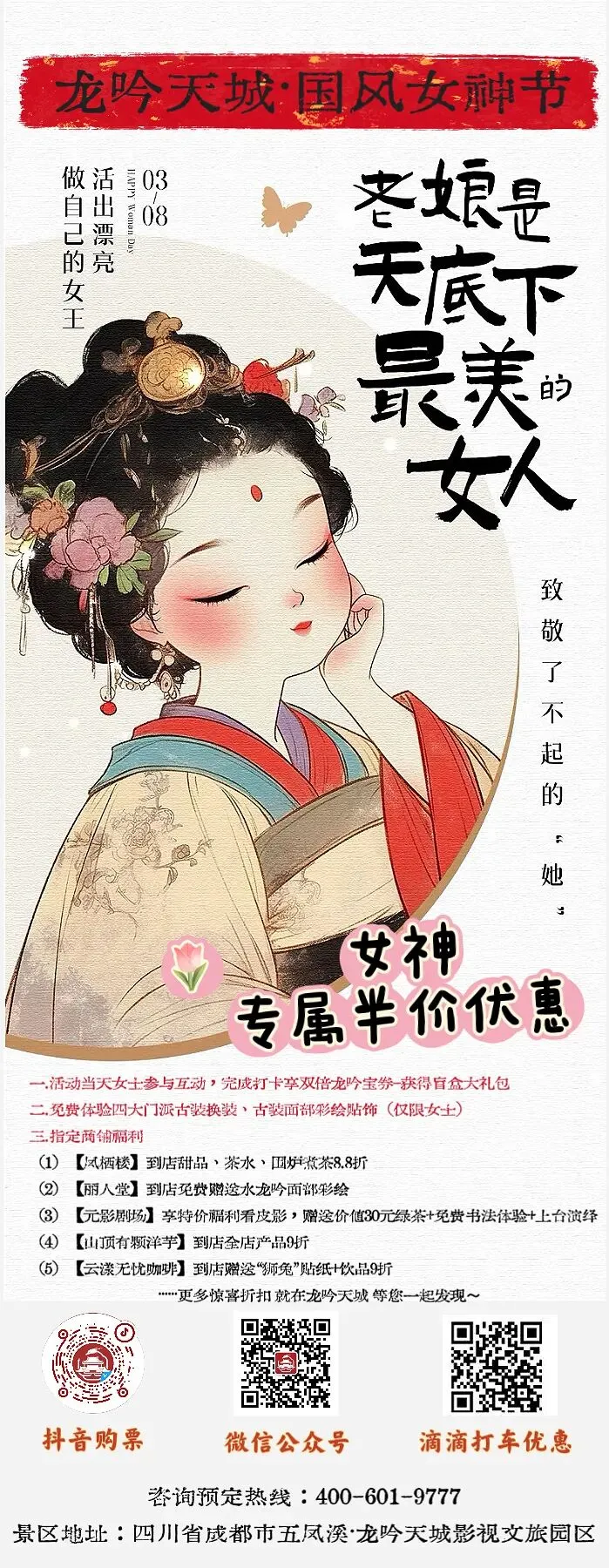 龙吟天城·国风女神节|3.8宠爱全攻略:双倍宝券+免费换装+全城半价+金堂本地人专享政策(3月1日起)