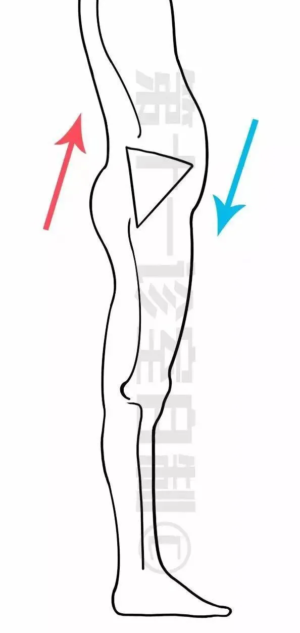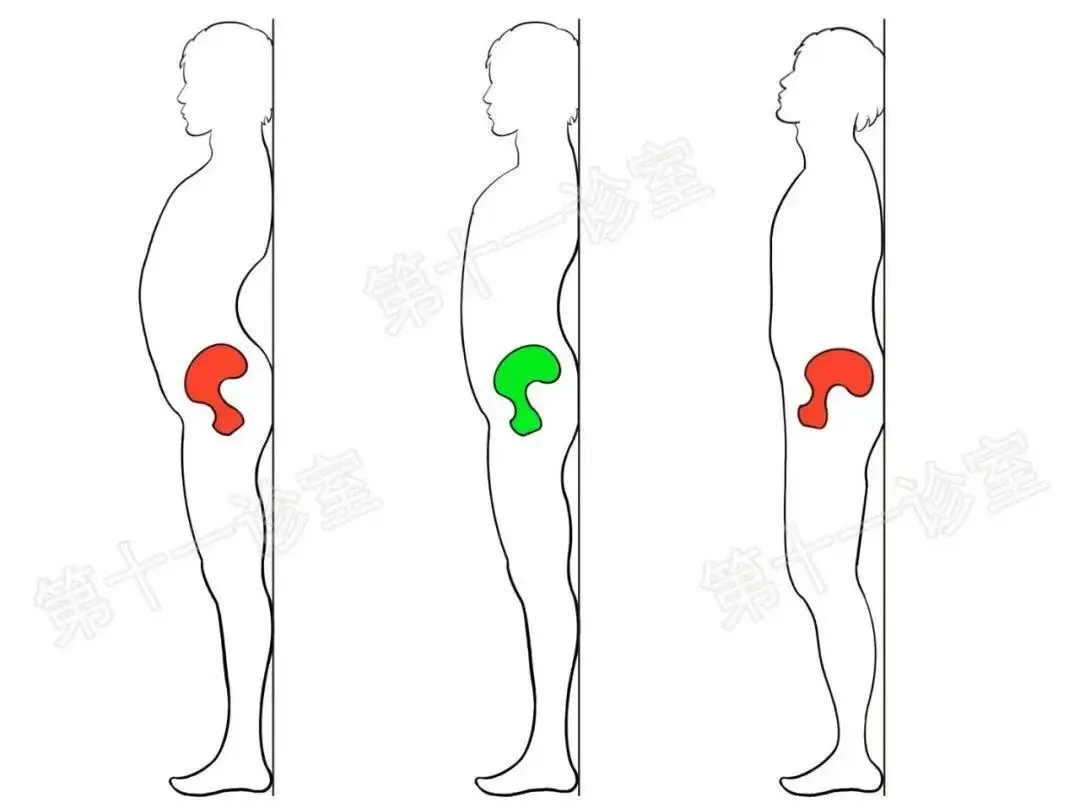 你看,这样一来这桶水就会明显前倾了,直接结果就是上半部分往前顶,让小肚子明显凸出来,下半部分向后顶,造成臀部翘起来。