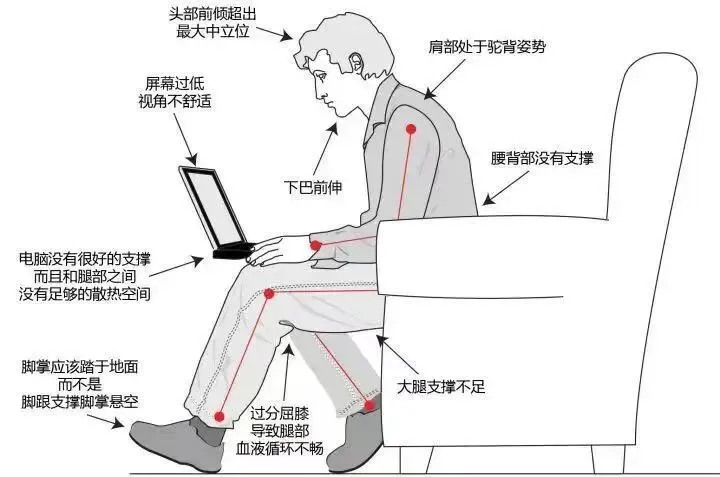 我们的上半身向前倾到恨不得扎进屏幕里,下半身又不能提供良好的支撑,就导致骨盆再次处于一个左右为难的状态,不得不以前倾的方式来保持平衡,好难啊!所以还是建议坐正坐直,选择合适的座椅和高度,以及眼睛距离屏幕的距离。