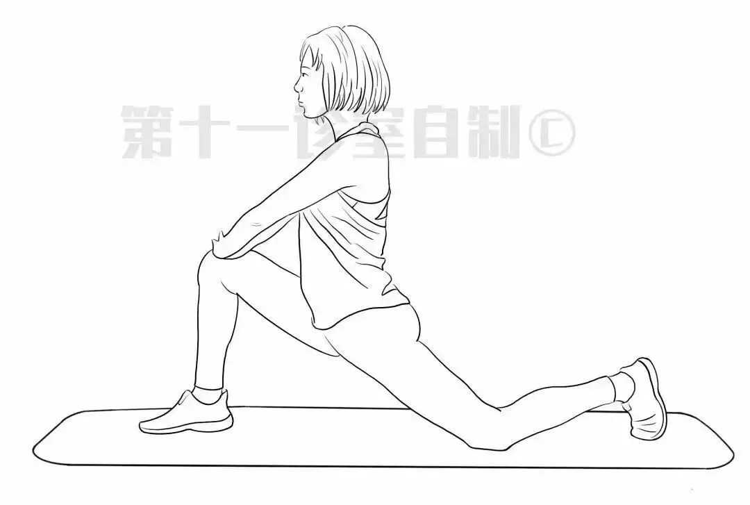 髂腰肌牵拉:用于放松紧张的肌肉,每次牵拉15~30秒,换腿,一天做3~4组。要点是膝盖要贴地面。