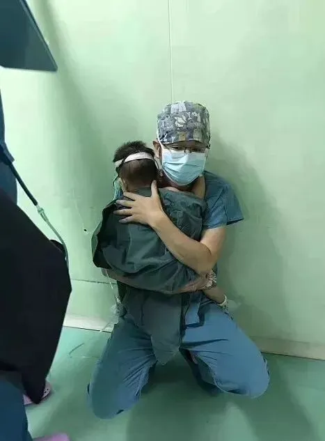 日前,一位1岁5个月大的患儿,在陕西汉中市人民医院,进行了胸壁脓肿切开引流术。小孩醒来后,心生畏惧大哭不止,麻醉医师张华军便将她从手术室台上抱了起来。