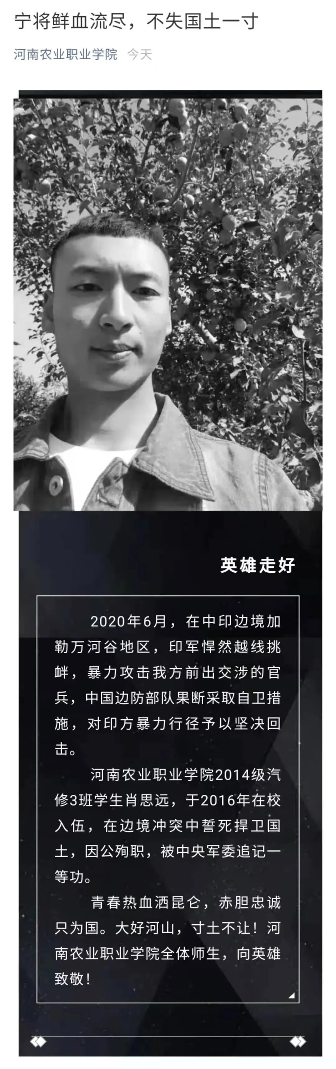 19日,河南农业职业学院发文致敬