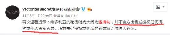 但在11月3日,维多利亚的秘密官方微博发出提示:维多利亚的秘密时尚大秀为邀请制,并不官方出售或授权任何机构或个人售卖秀票,所有未经授权或伪造的秀票将无法进入秀场。