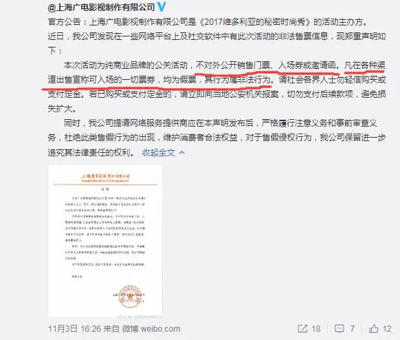 此次维密秀的主办方上海广电影视制作有限公司发布公告宣称,本次活动为纯商业品牌的公关活动,不对外公开销售门票、入场券或邀请函。凡在各种渠道出售宣称可入场的一切票券,均为假票,其行为属非法行为。