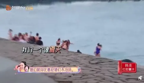 到了海滩边,女孩们都应景地穿着比基尼,而他们则包裹地严严实实。