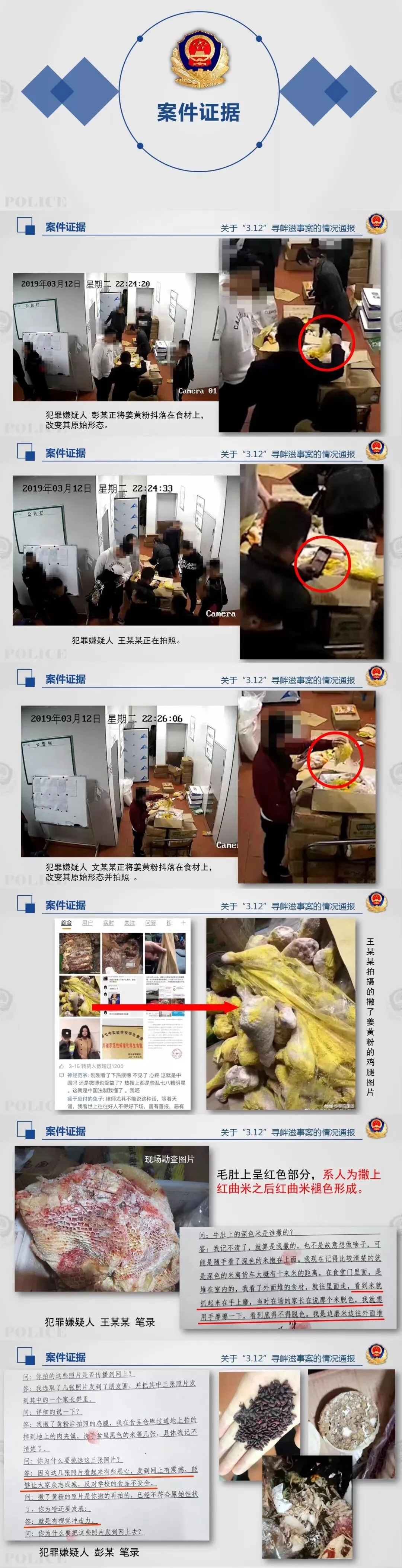 新闻发布会上,为以正视听,成都市公安局在法律允许范围内,对“3.12寻衅滋事案”依法调取的部分案件证据,包括视频监控的制作拍摄虚假食材照片情况,嫌疑人通讯记录、犯罪嫌疑人的悔过视频等,向媒体作简要披露。