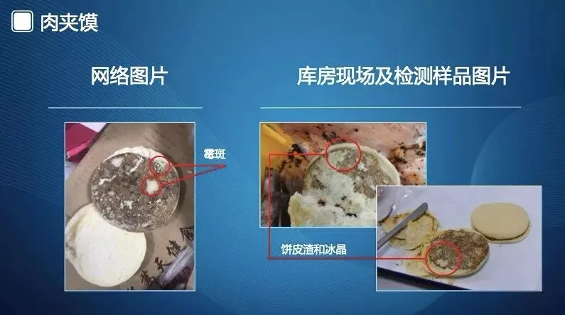 第一组是肉夹馍照片。左边是网络流传的“发了霉的肉夹馍照片”;右边第一张拍摄于冻库、第二张拍摄于实验室。对比发现,左右两边照片的肉夹馍色泽有明显差别,肉夹馍表面白色部分为饼皮渣和冰晶,不是发霉的肉夹馍。