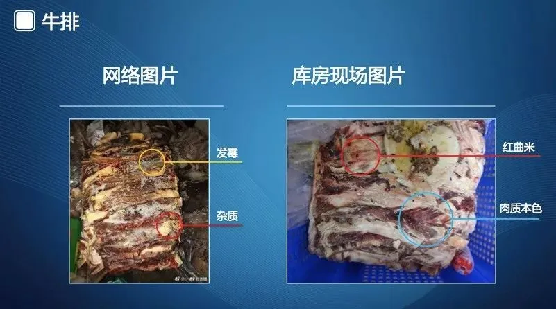 第二组是牛排照片。左边是网络流传的“发霉、有杂质的牛排”照片;右边是拍摄于学校冻库的牛排照片。右边照片清楚显示,牛排表面没有发霉,“杂质”实际上是红曲米。