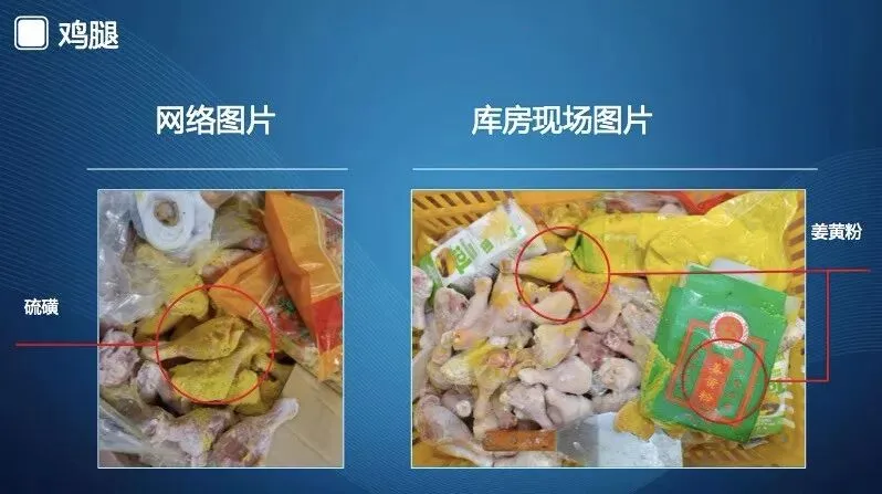 第三组是鸡腿照片。左边照片是网络流传的“使用了硫磺的鸡腿”;右边照片清楚显示,鸡腿表面的黄色粉末是姜黄粉,不是硫磺。