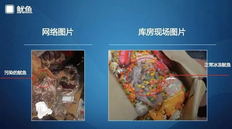 第四组是鱿鱼照片。左边是网络流传的“污染了的鱿鱼照片”;右边照片是冰冻鱿鱼,色泽正常,其上附着的黄色、绿色物为玉米、豌豆、火腿肠等其它食材。