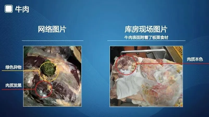 第五组是牛肉照片。左边是网络流传的“变质牛肉”;右边是冻库拍摄的牛肉照片,冰冻牛肉的色泽正常,其表面有淡黄色的板栗和白色的被撕破的食品包装袋,不是变质牛肉。