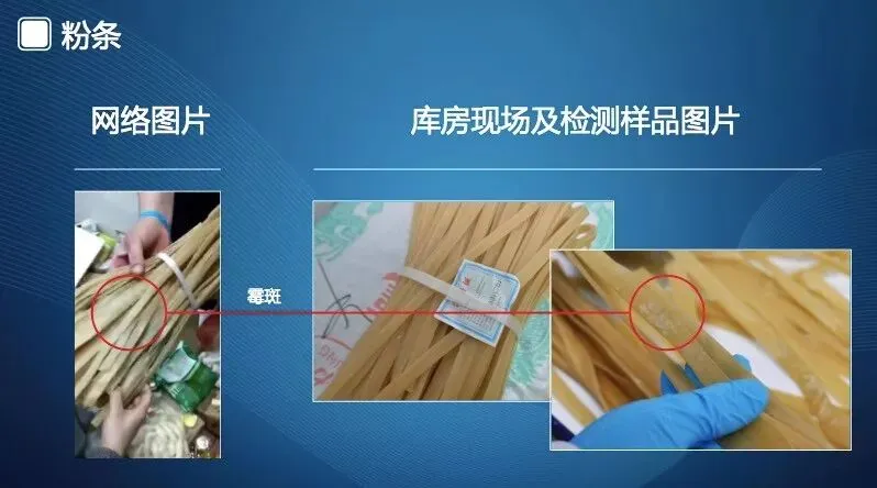 第六组是粉条照片。左边是网络流传的有霉斑的粉条照片;右边是库房及检测机构实验室拍摄的粉条照片。经专家和四川源坤国科质量检验有限公司检测人员鉴定,粉条表面有肉眼可见的霉斑,检验结果为不合格。