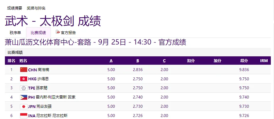 武术男子太极拳太极剑全能比赛中,高浩楠获得冠军。他在太极拳比拼中得到9.830分,太极剑得到9.836分,总分为19.666分。
