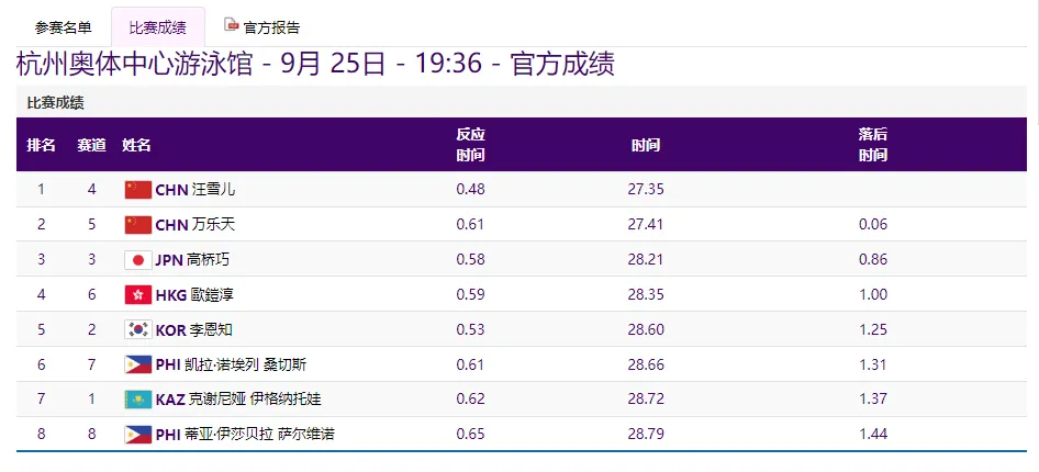 女子50米仰泳决赛,汪雪儿以27秒35的成绩成功夺冠。万乐天以27秒41的成绩获得亚军。
