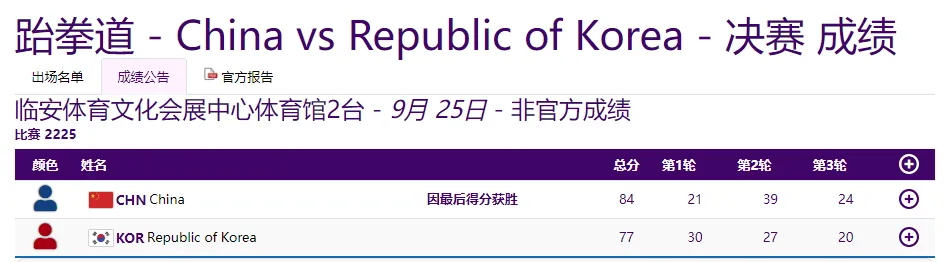 在跆拳道竞技混合团体决赛中,由崔阳、宋兆祥、宋洁、周泽琪组成的中国队以84:77击败韩国队,夺得冠军。这枚金牌也是中国跆拳道队在本届亚运会获得的首枚金牌。