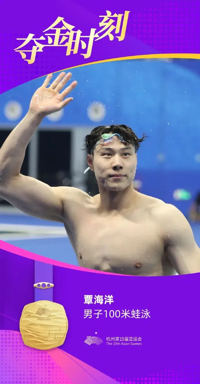 男子100米蛙泳决赛中,中国“蛙王”覃海洋以57秒76的成绩打破亚运会纪录夺冠。这是他在本届亚运会收获的首枚金牌。覃海洋是本届亚运会中国体育代表团开幕式旗手之一。