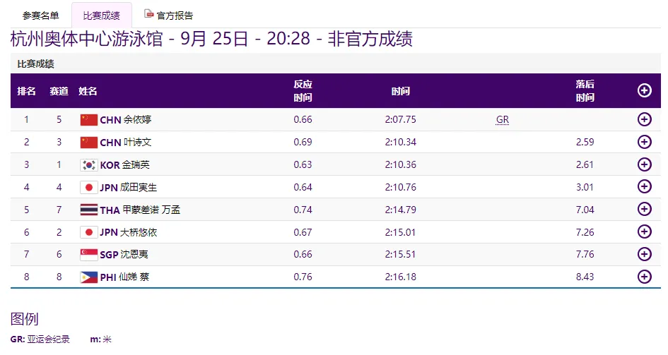 女子200米个人混合泳决赛中,余依婷以2分07秒75的成绩打破亚运会纪录夺冠。叶诗文以2分10秒34的成绩摘得银牌。
