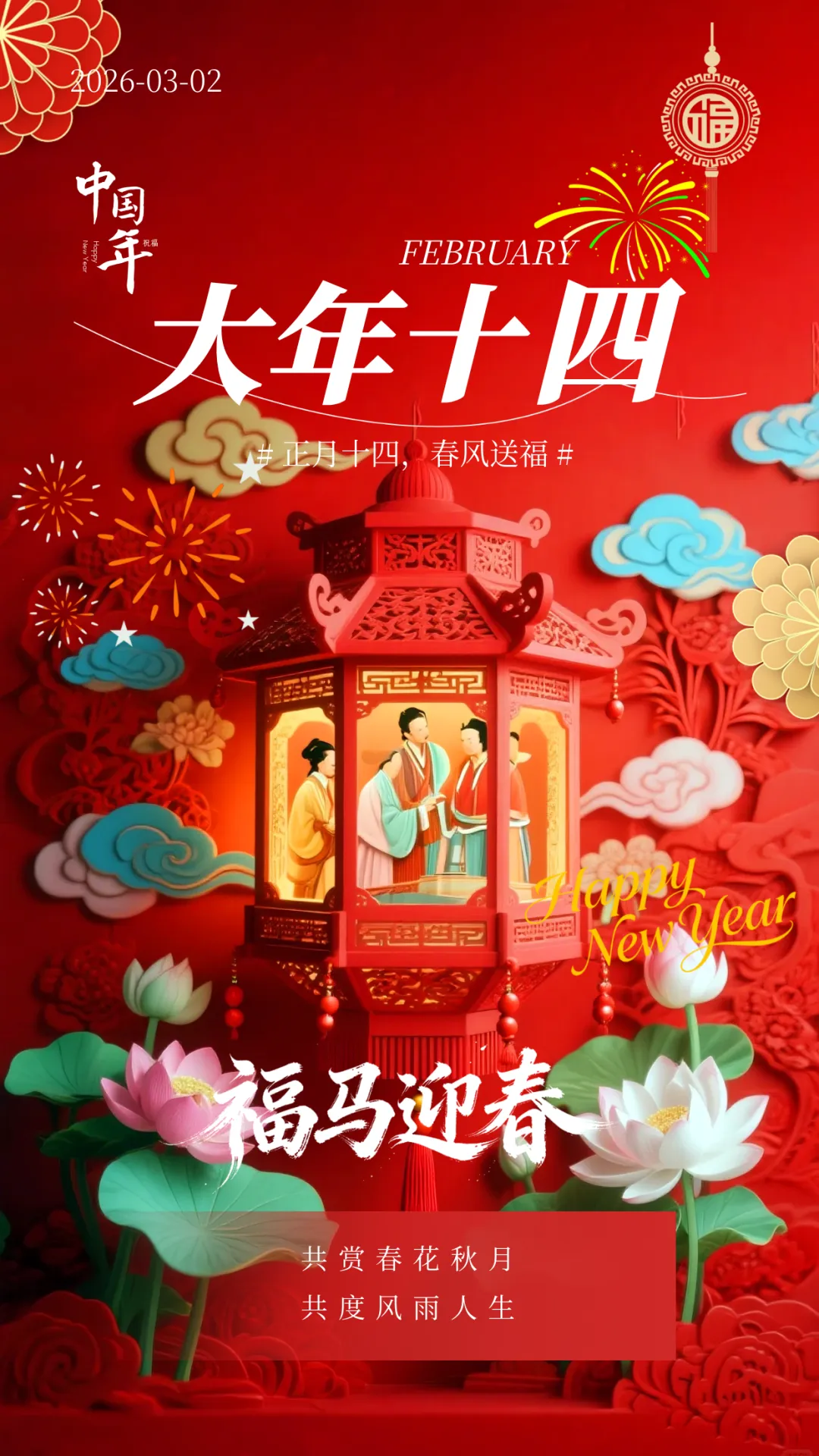 年十四春色满园,愿你财源大步来。金银财宝装满袋,平安如意无尘埃。事业成功登高处,生活美满笑颜开。身体健康是根本,心情愉快福常在。以此文字表心意,祝你幸福永不败。