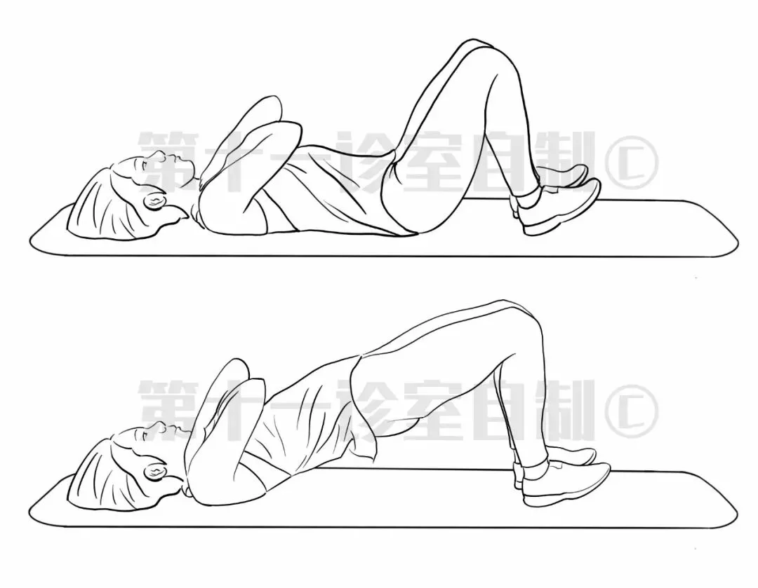 臀桥屈膝,勾脚,腰和髋保持在一条线上,一组10~15个,每天3~4组。