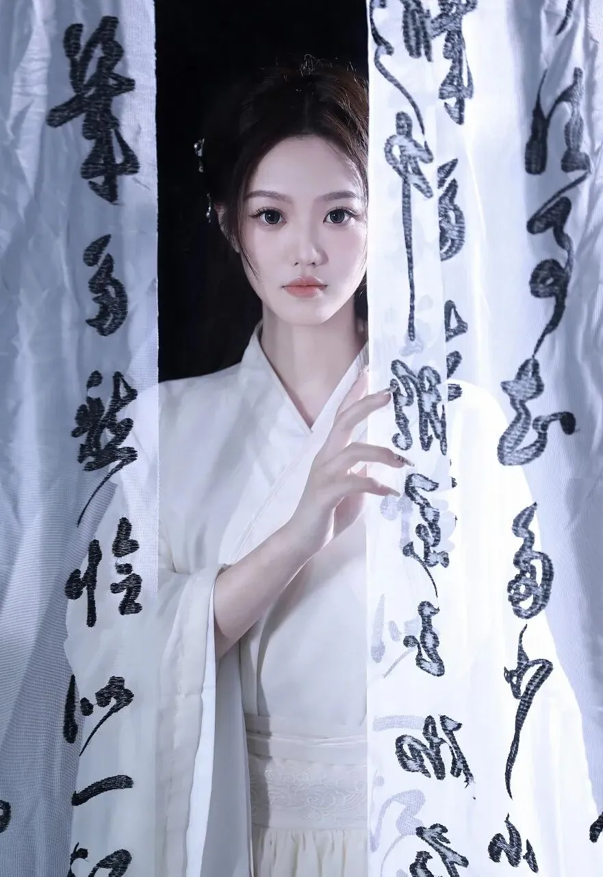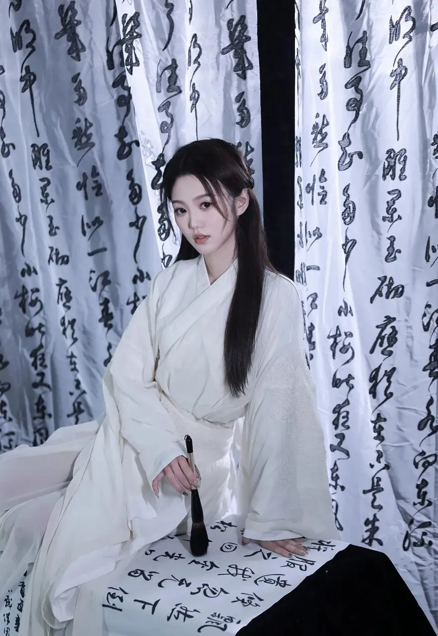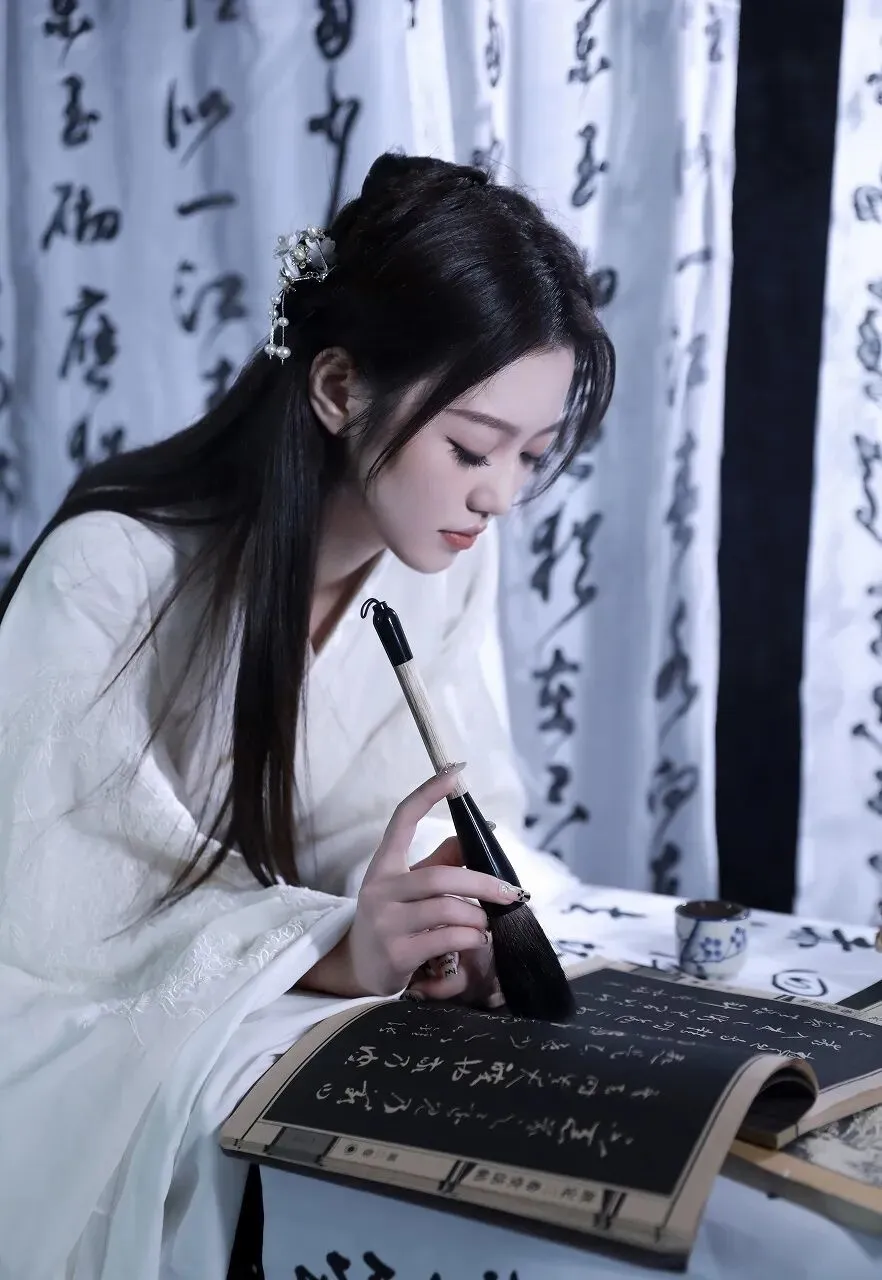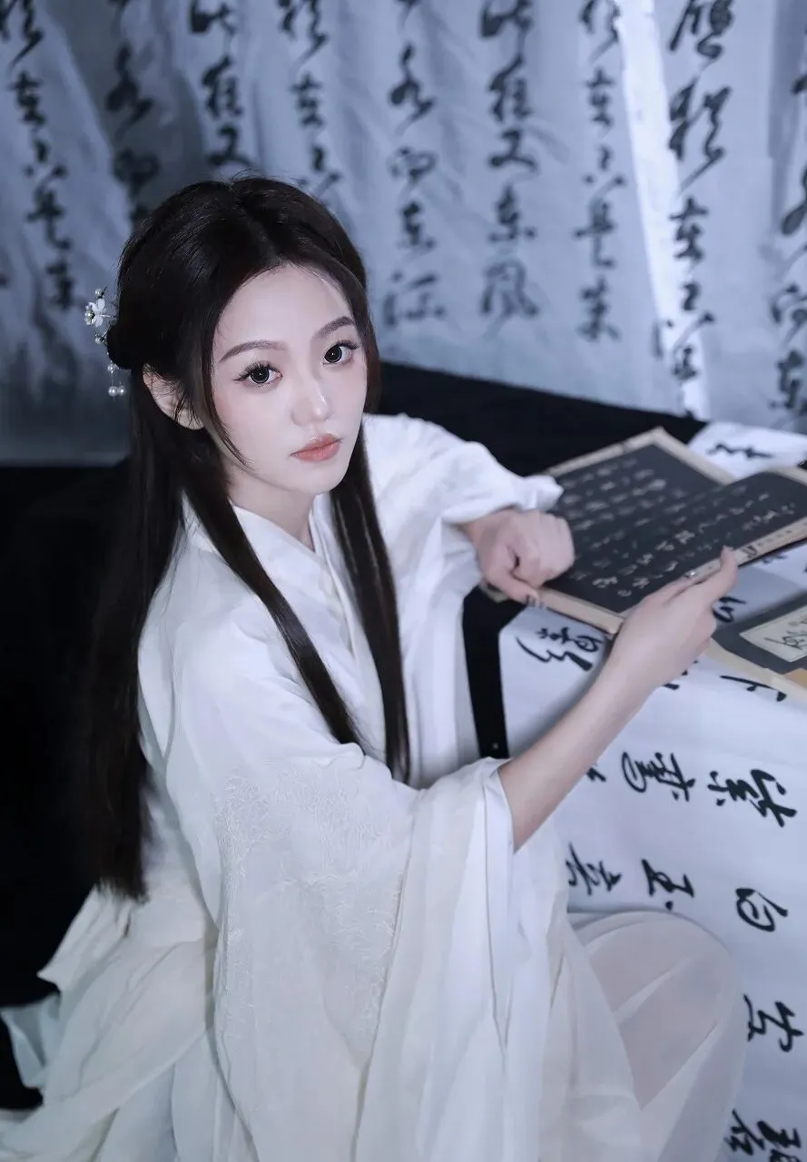 在时光的长河中,古典文化如一颗璀璨的明珠,散发着独特的光芒。当一位身着白色汉服的女子,置身于墨香四溢的书法作品之中,仿佛从千年前的画卷中款款走来,带着那份独有的温婉与优雅,开启了一场与古典文化的浪漫邂逅。女子一袭素白的汉服,衣袂飘飘,宛如仙子下凡。汉服的剪裁精致典雅,宽大的衣袖随风轻舞,似在诉说着古老的故事。衣服上的刺绣细腻入微,虽不张扬,却处处透露着匠心独运。她的长发如黑色的瀑布般垂落,一支精致的发簪点缀其间,更添几分古典的韵味。妆容淡雅清新,眉如远黛,眼若星辰,唇似樱桃,仿佛是从诗词中走出的佳人。此刻,她正专注地看着手中的书法作品,右手轻轻指着上面的字迹,眼神中流露出对传统文化的热爱与敬仰。周围的背景布上,写满了行云流水般的书法文字,或刚劲有力,或飘逸灵动,每一笔每一划都蕴含着书法家的情感与心血。墨香在空气中弥漫,与女子的温婉气质相互交融,营造出一种静谧而深远的氛围。
