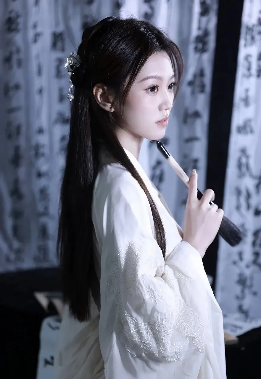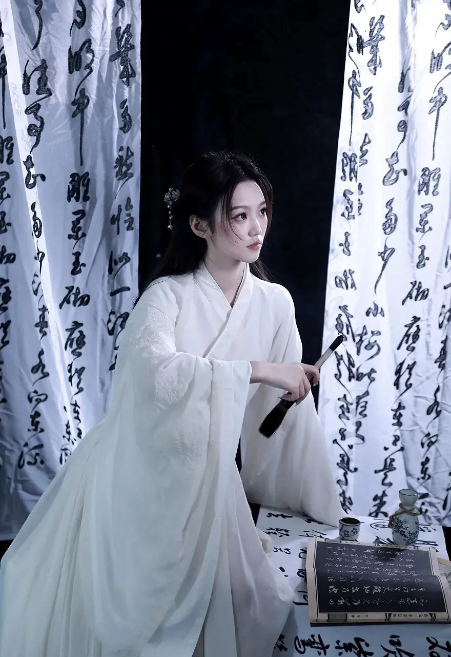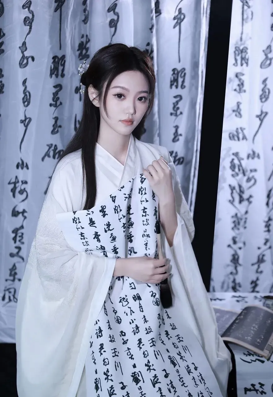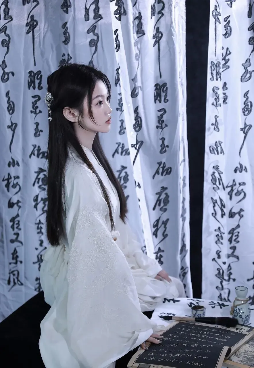 在时光的长河中,古典文化如一颗璀璨的明珠,散发着独特的光芒。当一位身着白色汉服的女子,置身于墨香四溢的书法作品之中,仿佛从千年前的画卷中款款走来,带着那份独有的温婉与优雅,开启了一场与古典文化的浪漫邂逅。女子一袭素白的汉服,衣袂飘飘,宛如仙子下凡。汉服的剪裁精致典雅,宽大的衣袖随风轻舞,似在诉说着古老的故事。衣服上的刺绣细腻入微,虽不张扬,却处处透露着匠心独运。她的长发如黑色的瀑布般垂落,一支精致的发簪点缀其间,更添几分古典的韵味。妆容淡雅清新,眉如远黛,眼若星辰,唇似樱桃,仿佛是从诗词中走出的佳人。此刻,她正专注地看着手中的书法作品,右手轻轻指着上面的字迹,眼神中流露出对传统文化的热爱与敬仰。周围的背景布上,写满了行云流水般的书法文字,或刚劲有力,或飘逸灵动,每一笔每一划都蕴含着书法家的情感与心血。墨香在空气中弥漫,与女子的温婉气质相互交融,营造出一种静谧而深远的氛围。