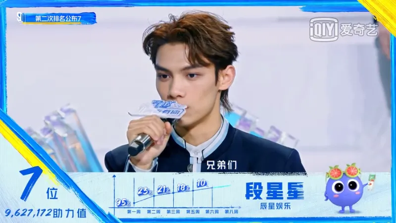 同样被看到的,还有段星星和刘冠佑。一公现场投票,段星星因零票全组垫底,为别人好成绩鼓掌的他脸上难掩落寞;而刘冠佑更是一度排名80几位,位置岌岌可危。但随着主题曲考核两人获得双A,以及后续二公舞台上的精彩表现,这两人的实力逐渐被大家看到和认可,此后便以黑马之势一路而上,分别以第7名和第13名冲入下一赛段。