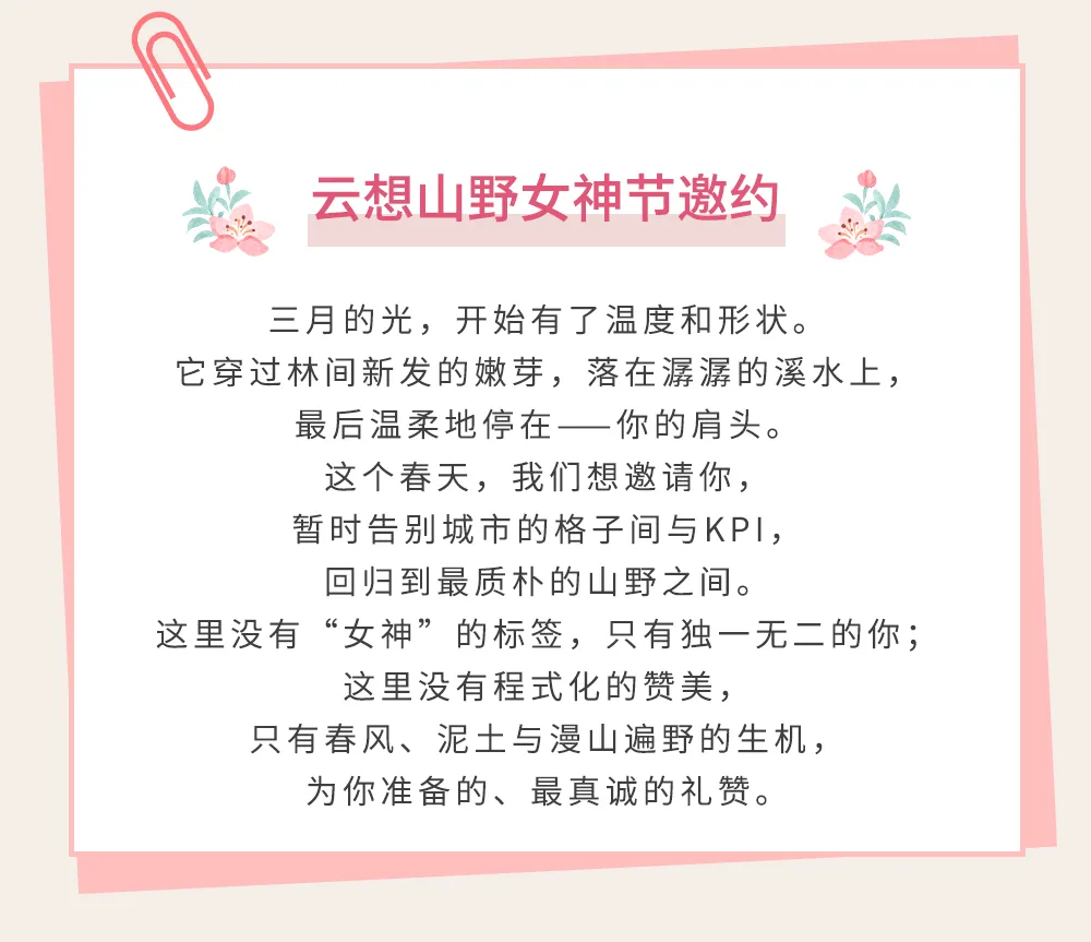 3.8女神节专属礼遇|赴一场云想山野之约,这份山野踏青邀约,专为闪耀的你而设