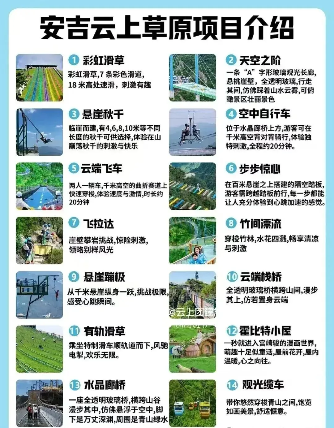 悬崖秋干、彩虹滑草、飞拉达·悬崖穿越、窝囊版蹦极,玻璃栈道等 30+多项悬崖游乐一票畅玩,在 1168 米云端之上尖叫狂欢!" 云上仙侠镇"构筑 1.5 公里云海仙市,20 余处仙侠幻境、高山游艺、NPO 闯关让仙侠梦照进现实,以云海仙市、高山游艺、梦幻夜游、国风旅拍、沉浸式互动为笔墨,以山峦云海为画布,讲述了“见鹿者得福报、守青山即修仙“的故事。游客在仙侠镇可沉浸体验到玄妙奇异的仙侠幻境、畅游国风国潮的云海仙市、打卡牧云入雾的仙风场景、玩转真人 NPC 仙界闯关、挑战炫目缤纷的山巅游乐。云上仙侠镇与云上草原四季美景交相呼应,进一步描绘了“绿水青山就是金山银山”的绝美画卷。