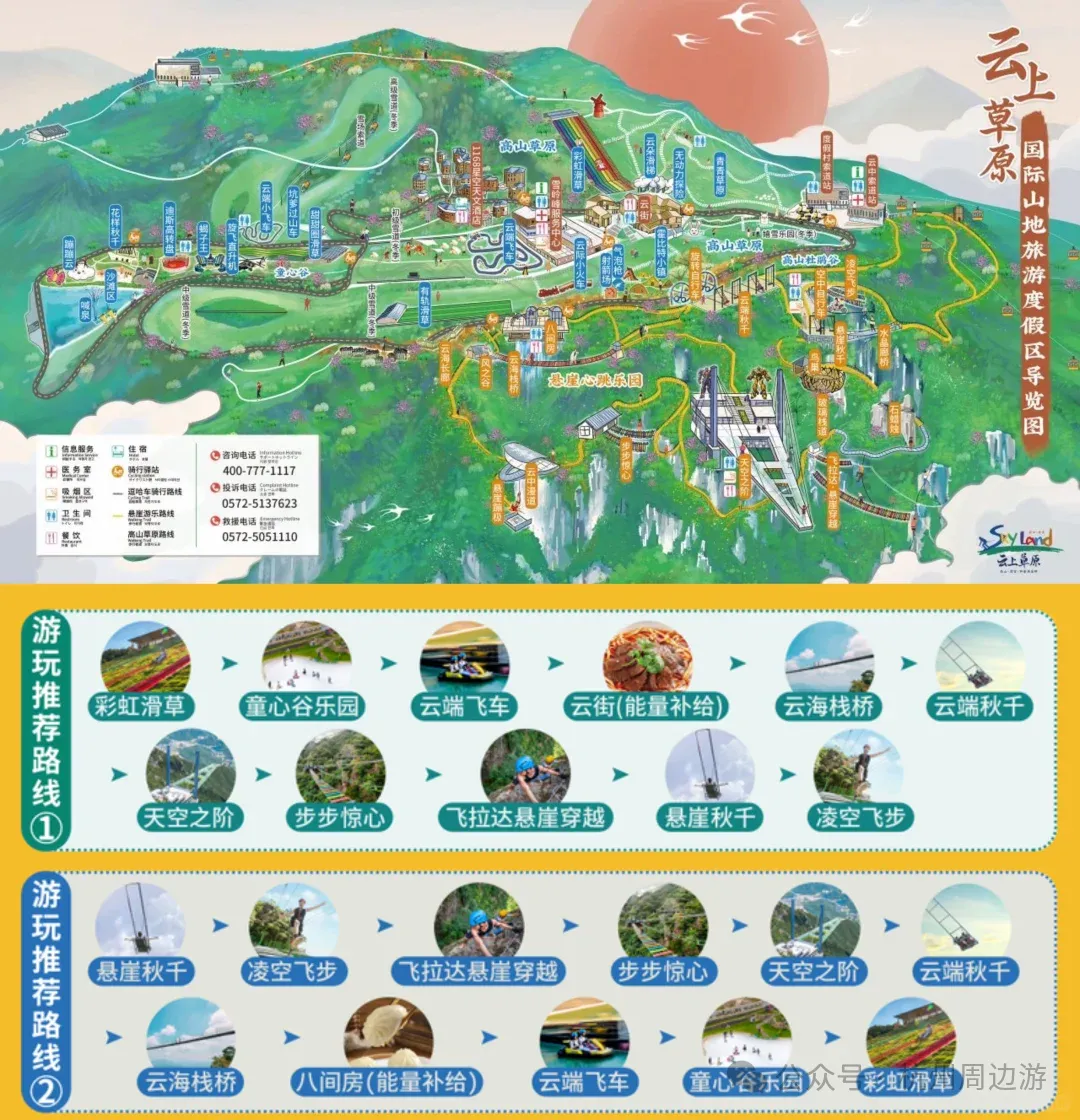 坐落在浙北之巅的云上草原,深入践行"两山”理念,发现山地美,践行共富梦打造世界级山地文旅景区,构筑起云端四大美域--"高山草原",南方空见天然草原霍比特小镇、童心谷,萌宠偶遇带您一秒穿越宫崎骏的童话世界,轻松打卡“浙里新西”;"悬崖心跳乐园",云海间的勇者挑战,天空之阶、魔鬼秋千(自理)、