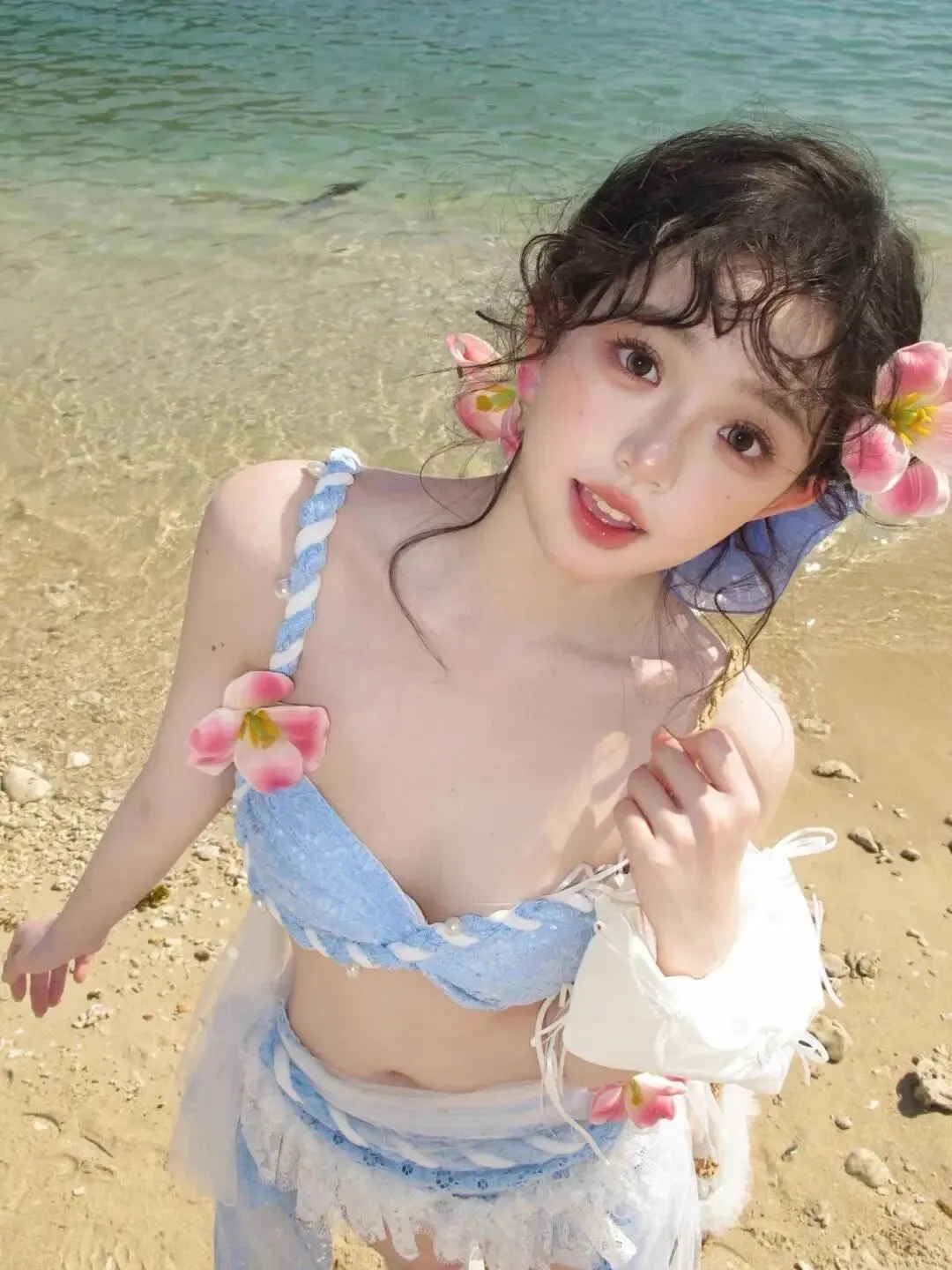 周末被老板抓来海边谈项目,我正对着咸腥的海风皱眉,余光突然扫到一抹晃眼的蓝。那是个穿雾霾蓝吊带裙的姑娘,海藻似的长发被海风卷着贴在白皙的颈侧,锁骨窝陷成两个小巧的坑,正蹲在沙滩上捡贝壳。她抬头的瞬间,我差点忘了呼吸——桃花眼浸着碎碎的光,鼻尖翘得恰到好处,连带着嘴角的梨涡都像盛了蜜。我鬼使神差地举起相机,快门按下去的瞬间,她突然朝我看了过来。