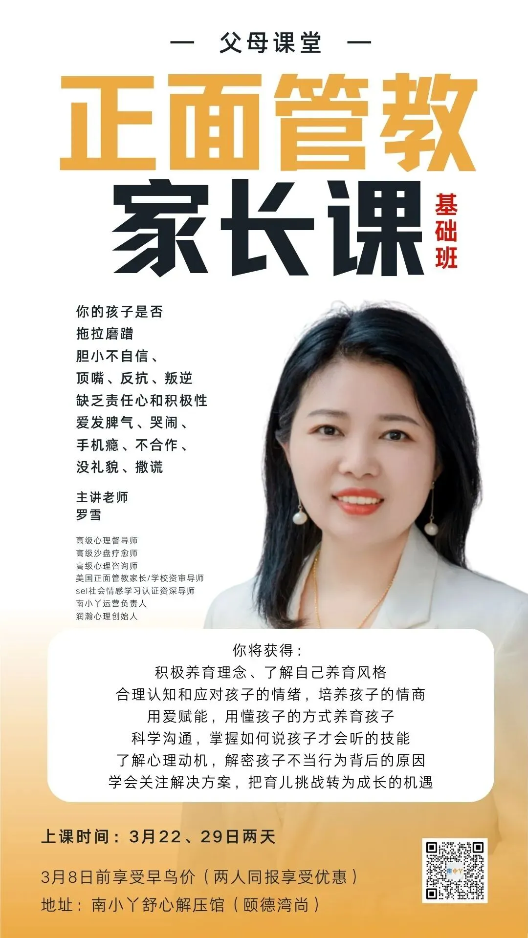 罗老师是国际认证正面管教家长讲师和学校讲师,拥有10多年一线家庭教育咨询经验。她不仅是两个孩子的妈妈,更是一位将阿德勒个体心理学理论与中国家庭实际情况完美结合的实战派专家。