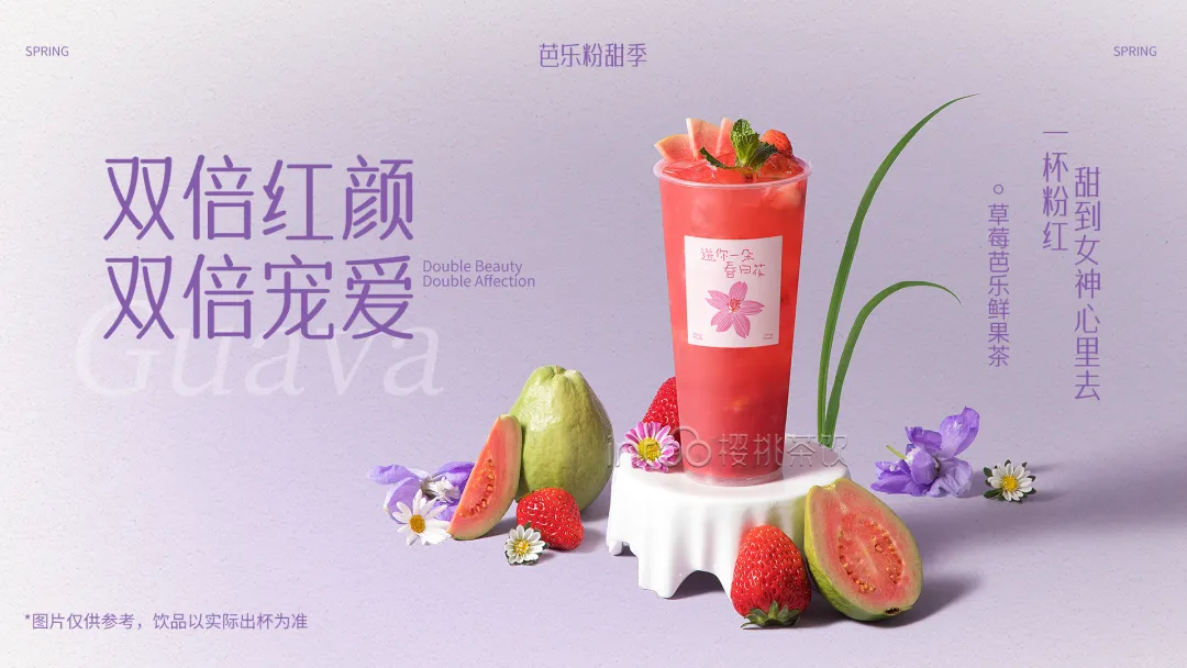 活动期间,芭乐系列全部升级「粉色限定杯贴」--送你一朵春日花,更加衬托芭乐粉嫩颜值,精致可爱,哪个女生拿到这样一杯饮品能不心动呢。