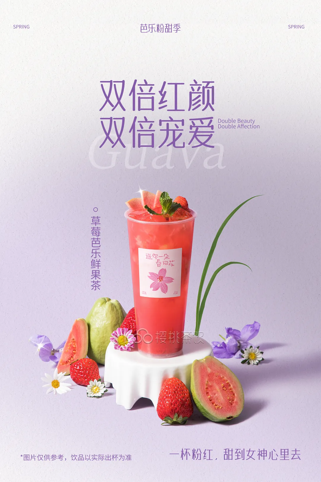 草莓的甜遇见芭乐的奇香,在茉莉茶汤中绽放成三月的第一束花,每一口都果肉、鲜爽,都是献给每一位女性的春日赞礼。