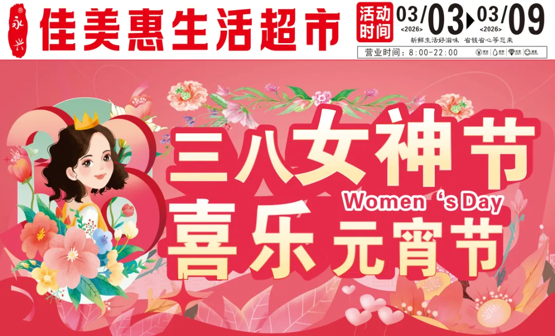 当前位置:首页>美女资讯>佳美惠生活超市“三八女神节,喜乐元宵节”活动时间:2026年3月3日-3月9日