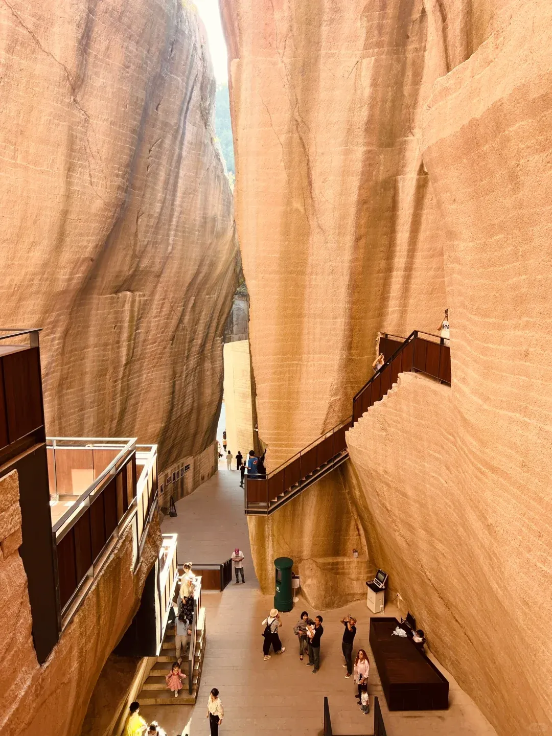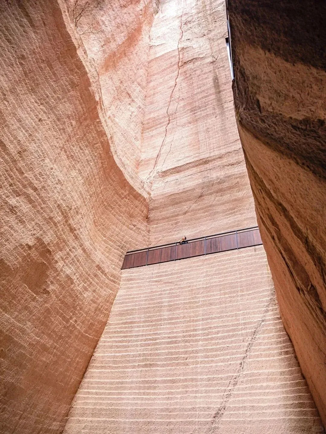 8号洞窟-岩宕书房,它曾是废弃的采石场,橙黄色的岩石环绕,岩壁上清晰可见开采时留下的一层层纹理。