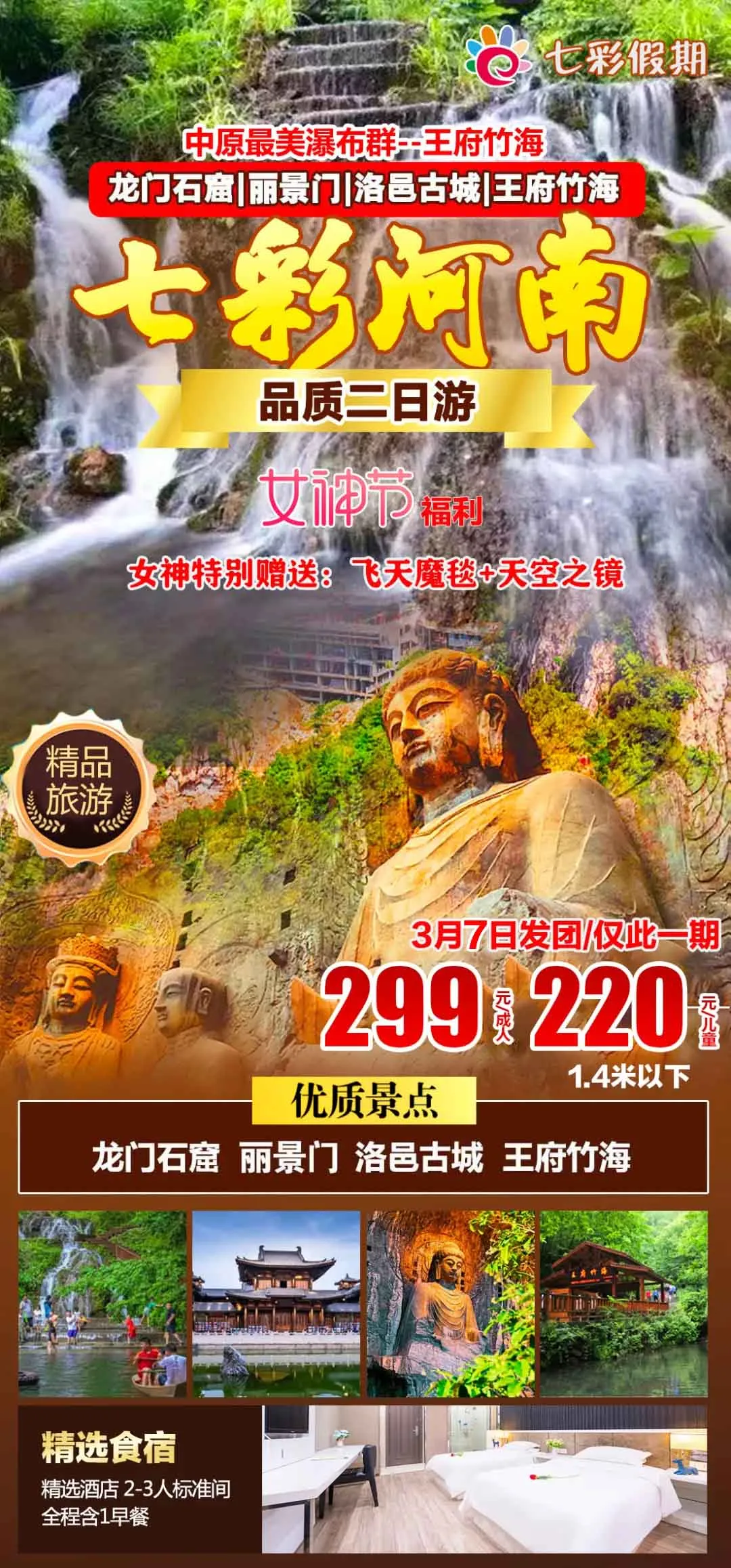 【女神福利/赠送飞天魔毯+天空之镜】洛阳龙门石窟、丽景门、洛邑古城、王府竹海二日游(特别推荐:中原最美瀑布群 - -王府