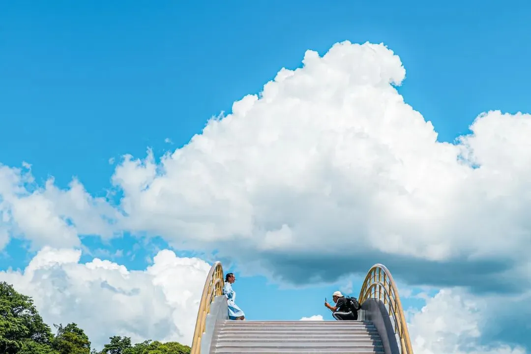 平台之上,到处都是拍照打卡的绝佳点位。站在边缘,以无垠碧空为背景,双手合十,定格下与观音合影的瞬间;或是蹲下身子,让镜头透过玻璃,倒映出湛蓝的天空,感受这一刻天地的开阔。