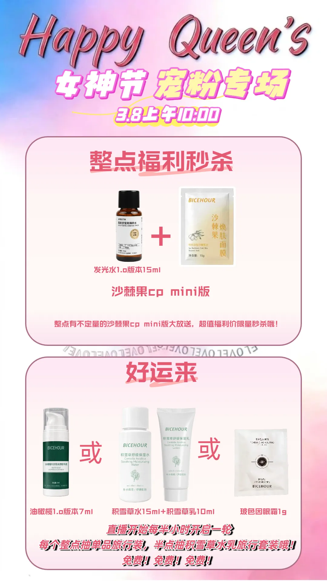 • 半点抽: 升级为惊喜水乳旅行装套组只要你在直播间,就有机会免费拿!