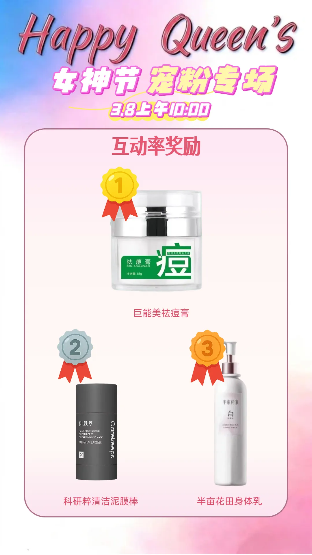 NO.7 陪伴大奖·硬货免费送陪伴是最长情的告白。全场互动榜/消费榜前三名的姐妹,我直接送祛痘膏、清洁泥膜等实打实的硬货正装!感谢你们一路相随!