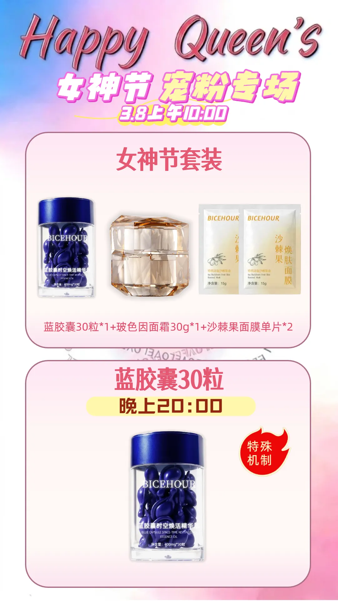 NO.1 爆款断货王·蓝胶囊特殊机制你们最爱的“以油养肤”神器——蓝胶囊,这次女神节有特殊机制惊喜上线!具体是什么?允许我先卖个关子,直播间揭晓!但我保证,绝对是让你心动的“囤货级”福利!