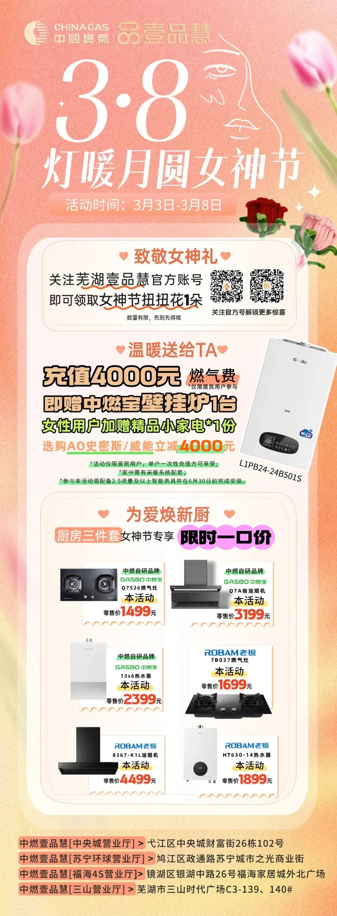 当前位置:首页>美女资讯>女神节福利 | 燃气充值送壁挂炉?厨房电器限时一口价!